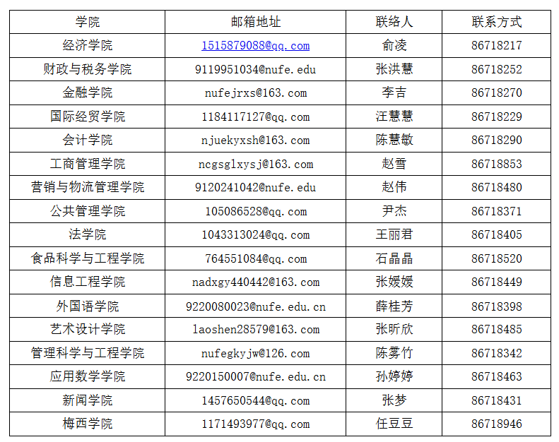各学院参赛报名材料收取邮箱地址及联络人信息详见下表: